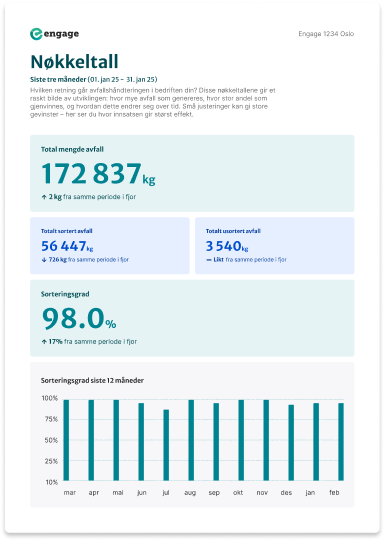 Følg mengdene som går til materialgjenvinning, energigjenvinning og deponi og få oversikt over utviklingen over tid. Perfekt for å dokumentere og forbedre miljøpåvirkning.